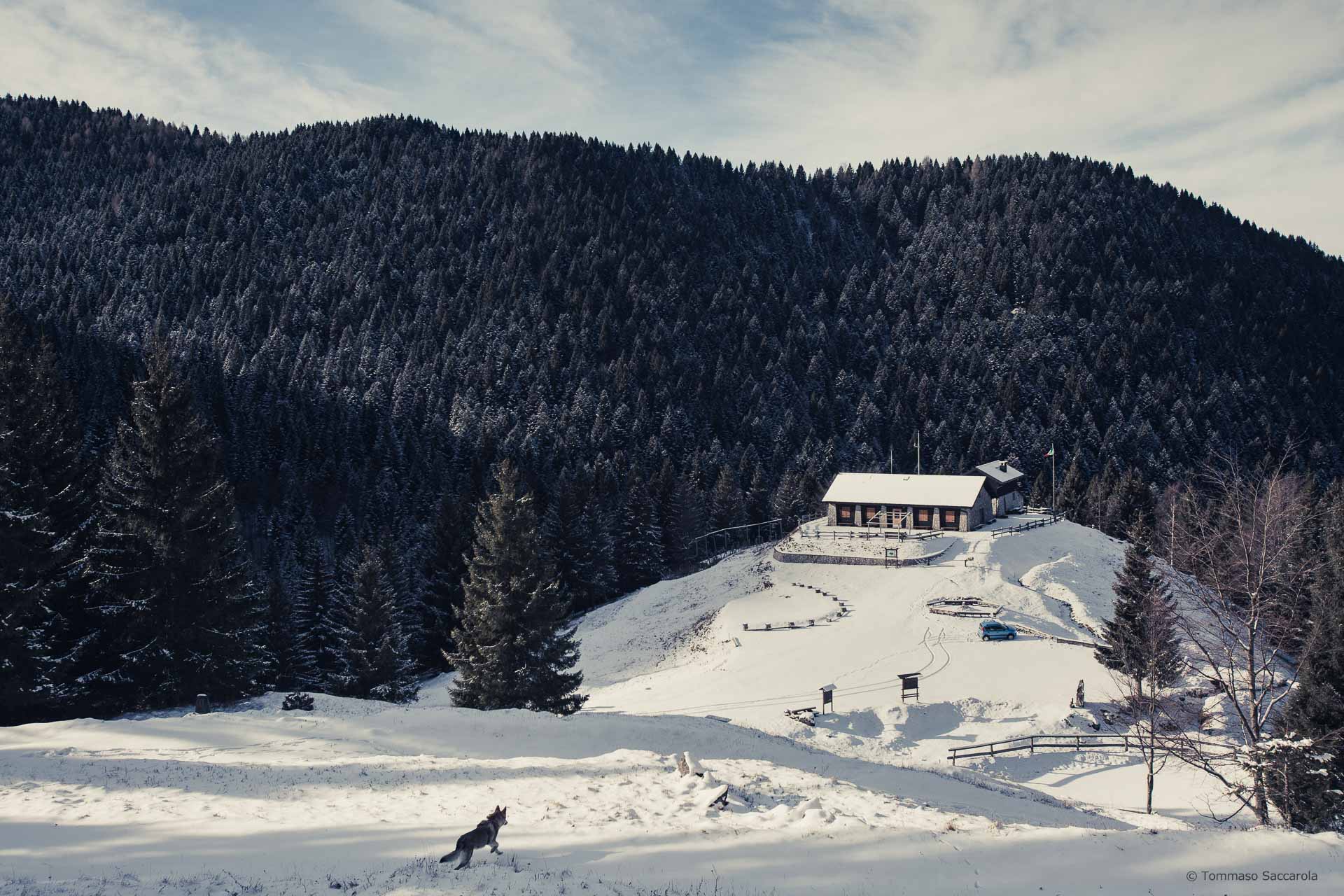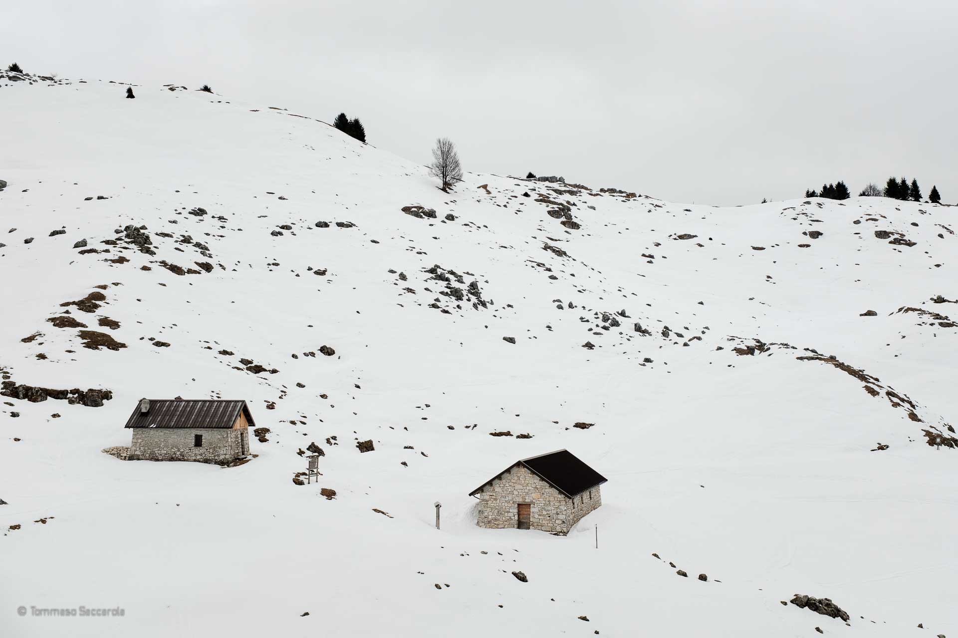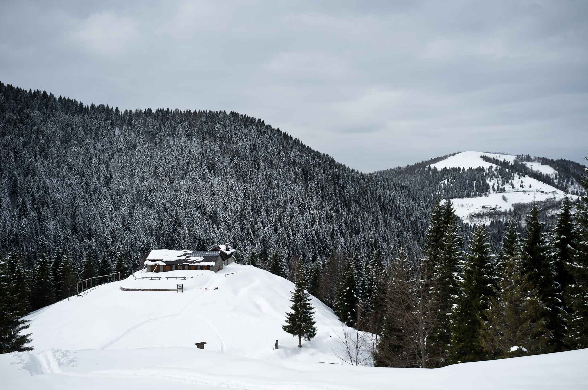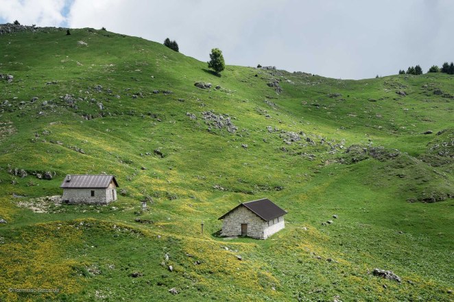 Una limpida mattina di giugno e una altrettanto limpida mattina di marzo. Due foto quasi uguali, dallo stesso punto di ripresa. La prima dominata dal verde di inizio estate, l’altra dal bianco delle abbondanti nevicate di fine inverno. La suggestione di questi luoghi rimane la stessa.